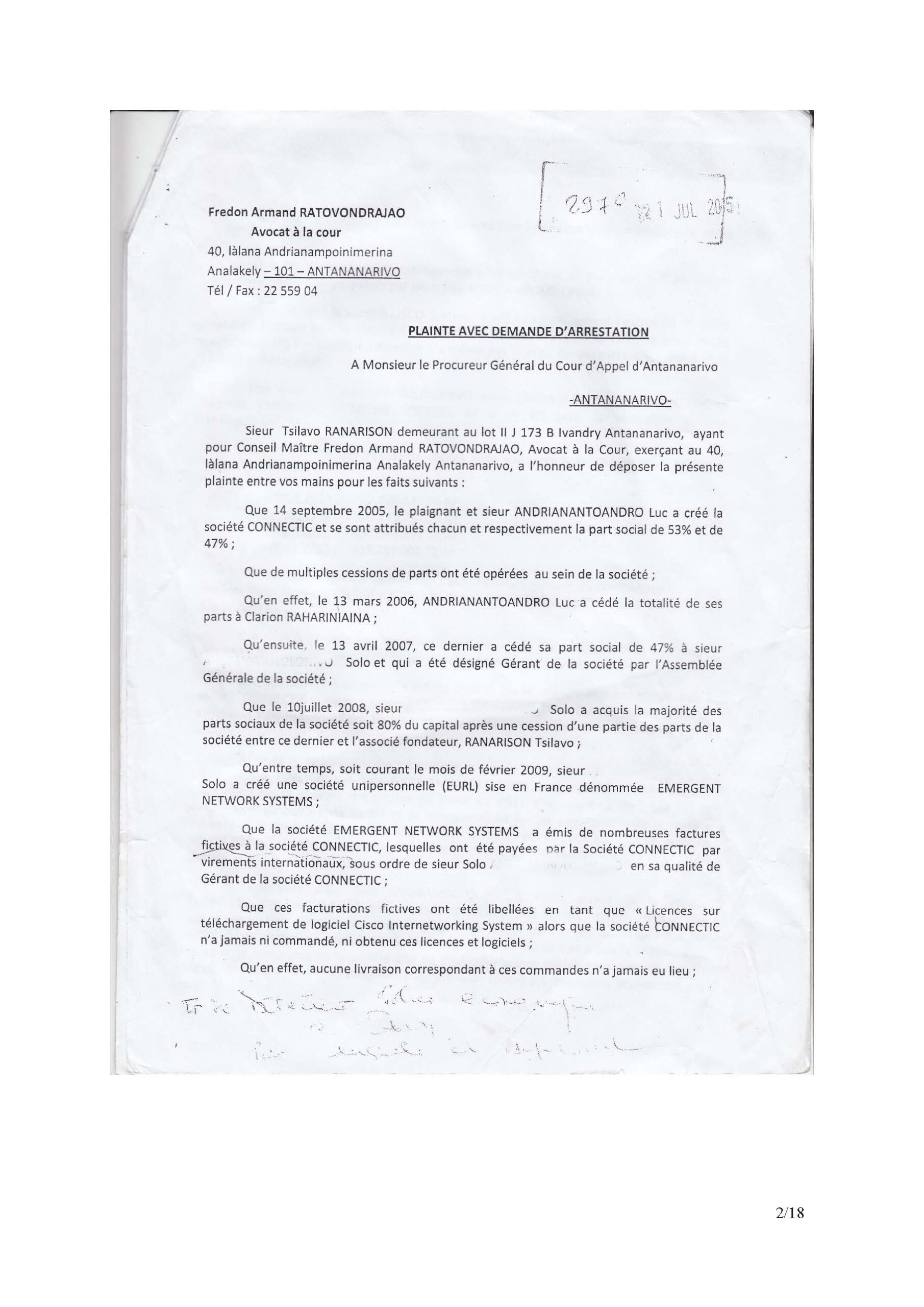 C’est pourquoi, le plaignant porte plainte contre sieur Solo domicilié au 64 Rue Pasteur Rabary Ankadilavato Antananarivo pour fraude, détournement et recel de biens sociaux, escroquerie, faux et usage de faux, faits prévus et punis par les articles 929, 930 et 931 relatifs aux infractions à la gérance, à l’administration et à la direction des sociétés de la loi 2003-036 sur les sociétés commerciales du 30 janvier 2004 ainsi que des articles 405, 150 et suivants du code pénal malgache et sollicite son arrestation.